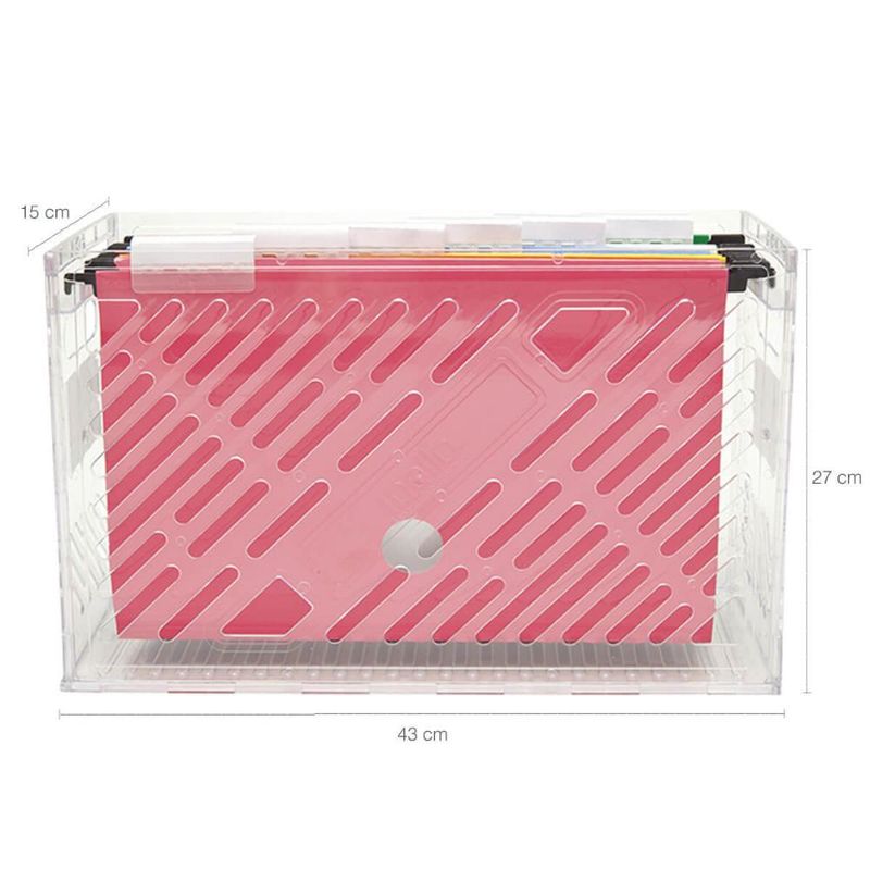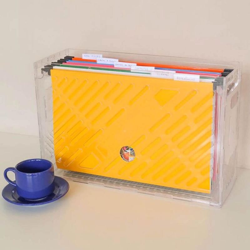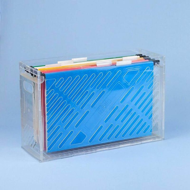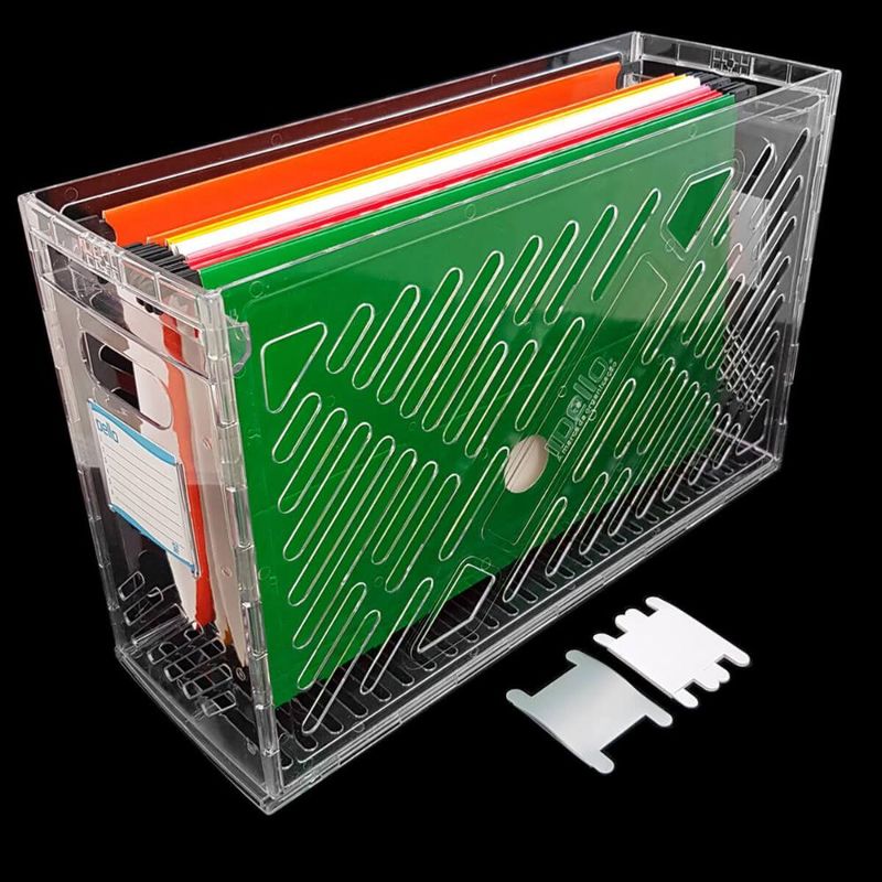 - As caixas para arquivo transparentes possuem alças laterais e estrutura vazada;