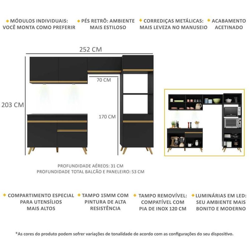 Cozinha - Altura: 203cm | Largura: 252cm | Profundidade: 32cm (aéreos) - 53cm (paneleiro e balcão com tampo)