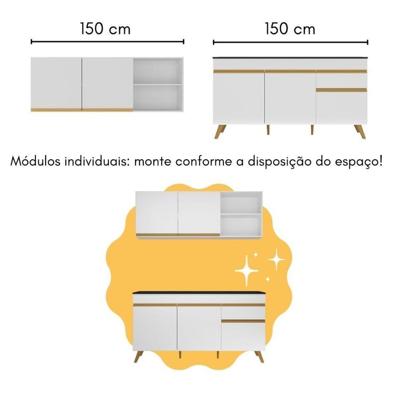 O Armário de Cozinha Compacta com Mesa Gourmet Veneza Multimóveis MP2201 é produzido em MDP com acabamento acetinado (cerca de 20% de brilho), garantindo durabilidade e resistência. O balcão com tampo removível (compatível com pia de 150cm) possui 3 portas, incluindo uma basculante, prateleiras e 1 gaveta com corrediças metálicas, que oferecem mais leveza no manuseio. Os tampos do balcão (suporta até 25kg) e da bancada (suporta até 20kg) são ambos de 15mm. O armário aéreo conta com 2 portas e prateleiras, proporcionando amplo espaço interno para organização dos utensílios de cozinha. Os pés no estilo retrô em polipropileno e os puxadores em ABS garantem estabilidade e elegância ao móvel. Versátil, a bancada conta com 1 porta, prateleira interna e adega embutida, o que facilita na hora de servir bebidas às suas visitas, além de poder ser utilizada também como divisora de ambientes. Este conjunto é uma ótima opção para deixar sua cozinha mais completa e funcional!
