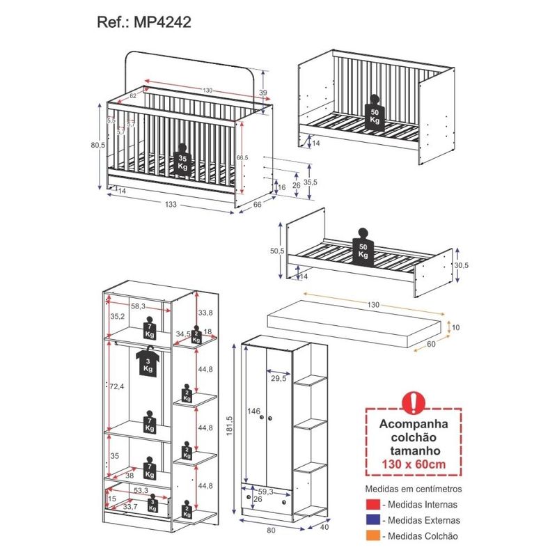 O Berço 3 em 1 com Guarda-Roupas 2 Portas 1 Gaveta e Colchão Incluso Doce de Leite Multimóveis MP4242 é fabricado em MDP com acabamento acetinado (cerca de 20% de brilho), garantindo durabilidade e facilidade na limpeza. O berço (suporta até 35kg) se transforma em minicama e sofá (suporta até 50kg), possui grade Soft (PVC), lastro com 3 regulagens de altura para o colchão e suporte para mosquiteiro, oferecendo noites de sono mais tranquilas e seguras. Certificado pelo INMETRO sob o selo n° 0000085/2018. Acompanha colchão de espuma (D18) com tratamento antiácaro, antialérgico, antimofo e um dos lados impermeável. O guarda-roupas conta com puxadores em ABS delicados, 2 portas, dobradiças metálicas, cabideiro que suporta até 3kg e 1 gaveta (suporta até 3kg) com corrediças metálicas (mais leveza no manuseio). Além disso, possui 4 prateleiras externas ideais para apoiar brinquedos ou objetos decorativos. Com um design encantador, este kit propicia estilo e conforto ao quarto do bebê.