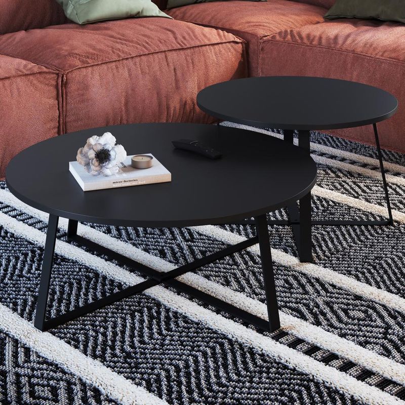 Conjunto Mesas de Centro 27960, personalidade e design moderno para sua sala de estar. Com bases metálicas em estilo geométrico (pintura epóxi) e tampos redondos em MDP 15 mm com acabamento BP. Ideal para trazer praticidade e sofisticação ao ambiente. Produto entregue em 02 volumes.