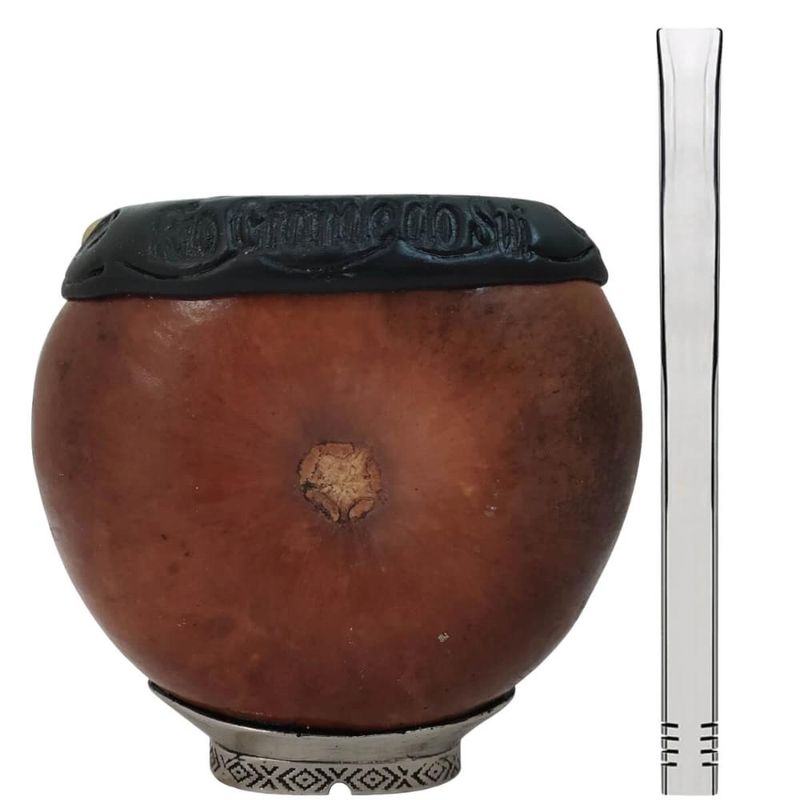 Cuia Gajeta Uruguaia de Porongo com Borda e Bomba 19cm Lisa Aço Inox Cano Largo Mola.