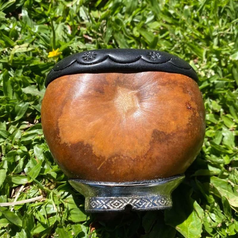 Limpeza e cuidados: não utilize materiais abrasivos para lavar a cuia; após tomar o chimarrão, retire a erva-mate e enxágue o interior com água corrente; guarde a cuia em um local seco e ventilado, sempre na posição vertical, garantindo que permaneça completamente seca;