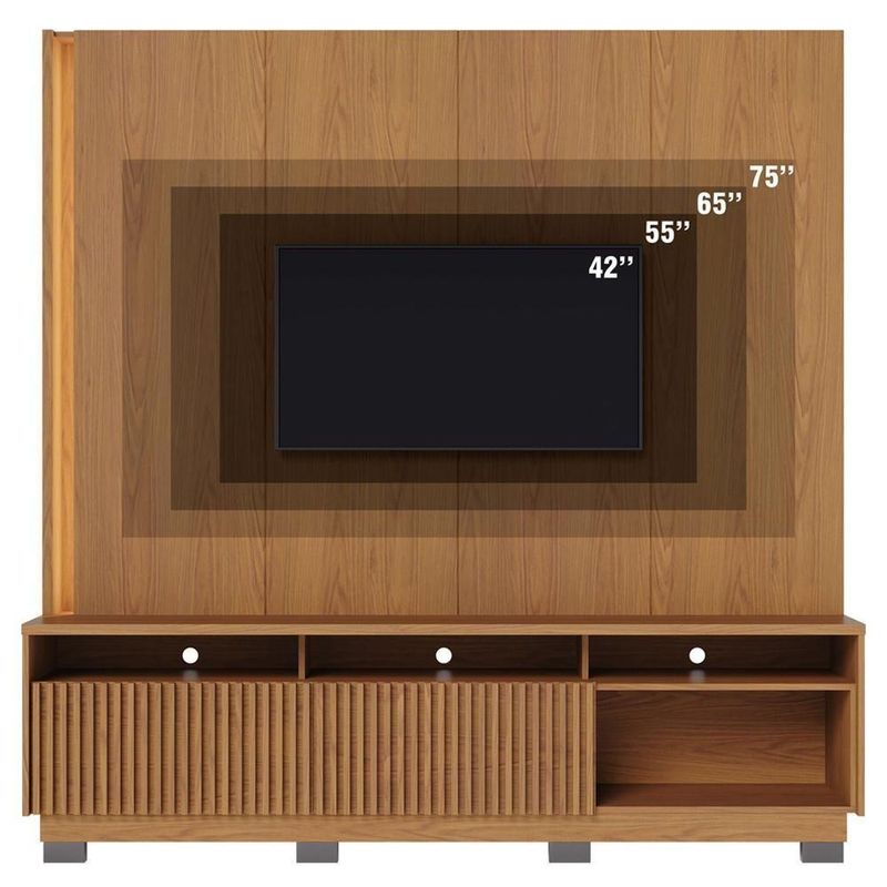 Essa estante home theater conta com um painel elegante, com detalhes chanfrados e uma suave iluminação LED na lateral, que cria uma atmosfera acolhedora e sofisticada. Já as portas deslizantes com design ripado artesanal não apenas embelezam, mas também oferecem funcionalidade, enquanto o tampo superior de 25mm assegura resistência e durabilidade. O diferencial fica na opção de montagem dos pés, podendo instalá-los ou não, depende do seu gosto pessoal. Além disso, essa estante para sala foi pensada para que sua TV de até 75 polegadas se torne uma verdadeira obra de arte fixada no painel, harmonizando perfeitamente forma e função.