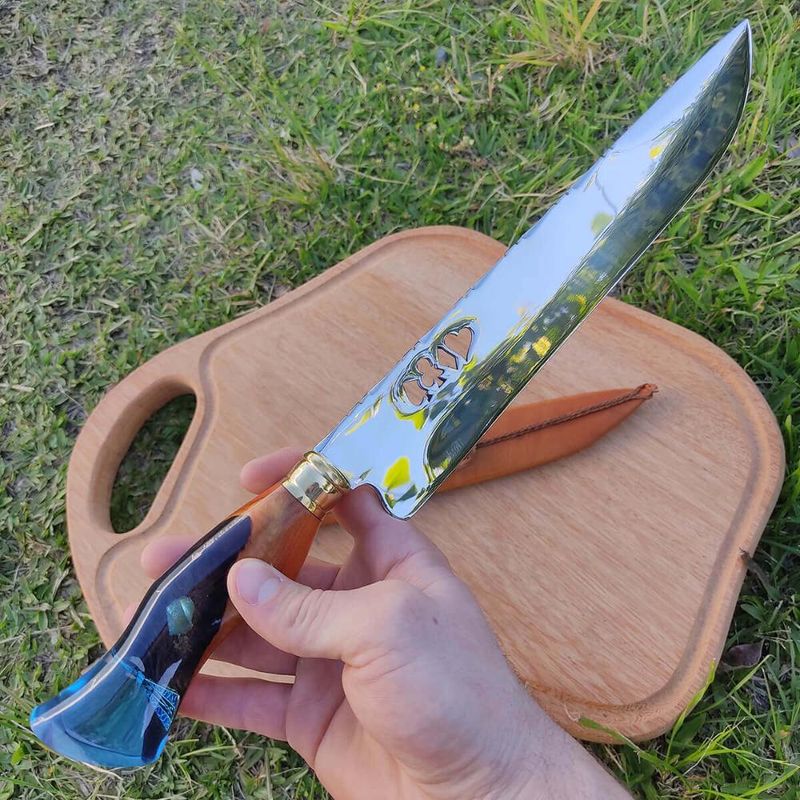 Faca para churrasco com cabo híbrido em resina e madeira, com imagem de Nossa Senhora Aparecida, feito artesanalmente, sendo cada faca única e exclusiva. A lâmina é feita em aço inox 420c, mesmo aço em bisturis, com excelente tempera e revenimento, a faca artesanal possui excelente corte e mantem o fio por muito tempo. A lâmina possui acabamento polido e corte a laser com desenho de naipe variados.