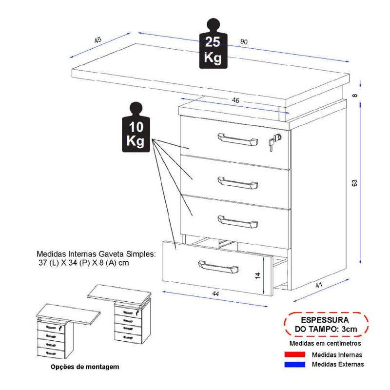 - 4 gavetas espaçosas com corrediças metálicas: organização eficiente dos objetos de trabalho.