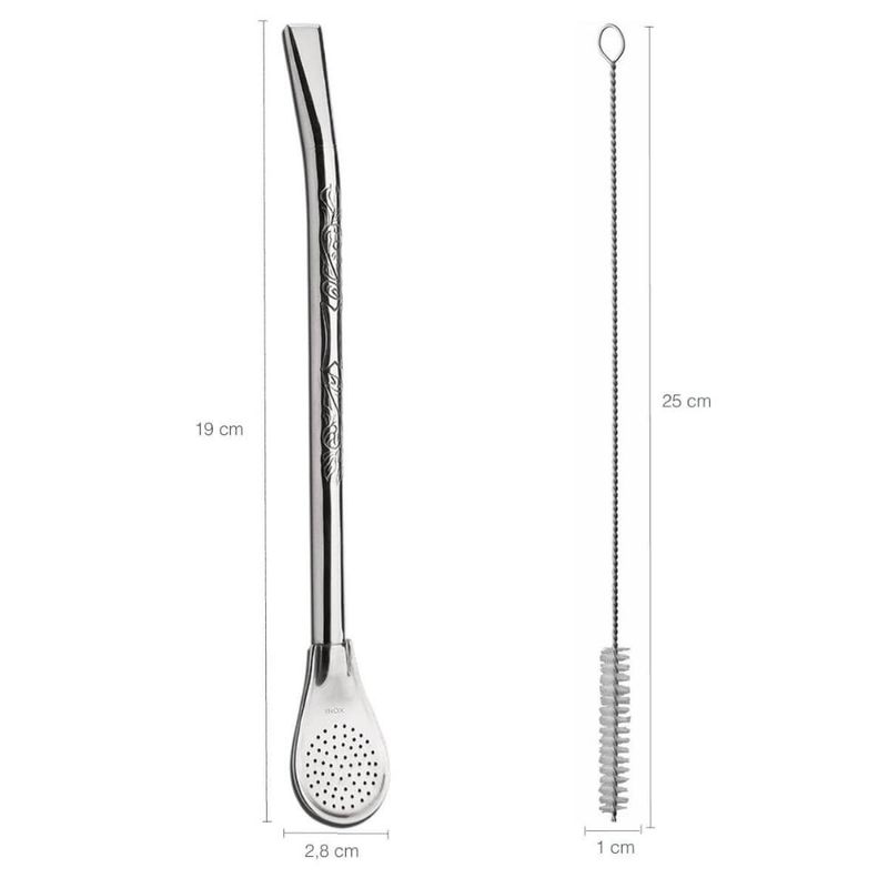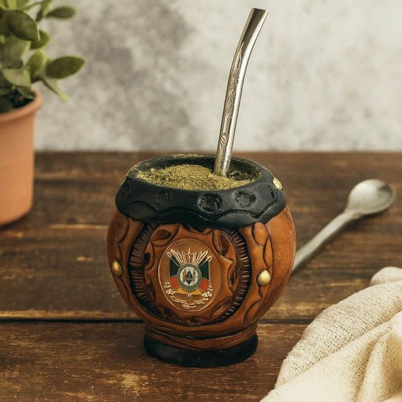 Conjunto completo e tradicional para apreciar um bom mate com estilo e autenticidade. A bomba é feita em aço inox, com 19cm de comprimento, com bojo em formato de pêra, desenho decorativo em alto relevo e rosca inferior que facilita a desmontagem e limpeza. Robusta, resistente e funcional, oferece excelente filtragem e durabilidade. Acompanha uma cuia artesanal no estilo uruguaio gajeta, com acabamento rústico e detalhe em metálico com brasão, que valoriza ainda mais a peça. Seu design ergonômico proporciona conforto no uso e um toque de tradição ao ritual do chimarrão. Ideal para quem aprecia qualidade, estética e cultura na hora de servir e saborear a bebida.