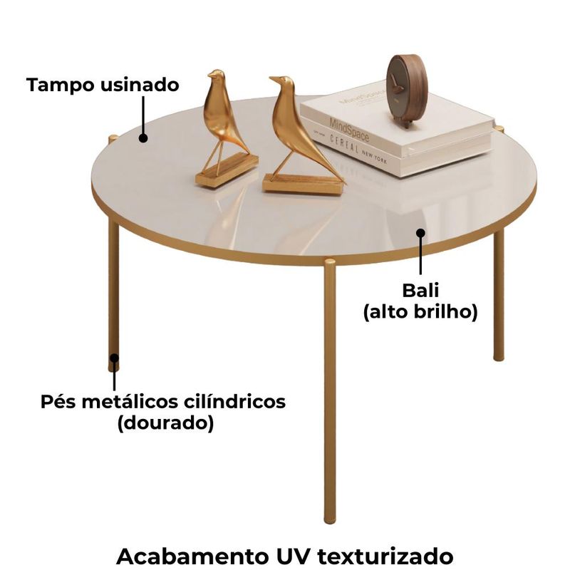 Mesa de Centro Cleia, um toque de modernidade e elegância para sua sala. Estrutura em MDF com acabamento em pintura UV texturizada (bordas em pintura PU). Possui tampo usinado e pés metálicos em formato cilíndrico. Este produto será entregue em 2 volumes.