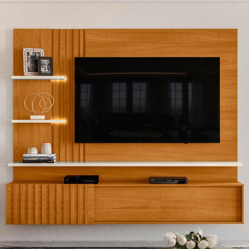 Iluminação embutida, ripados elegantes e portas de correr: o Painel Aurora é a escolha ideal para quem busca um visual atual e funcional.