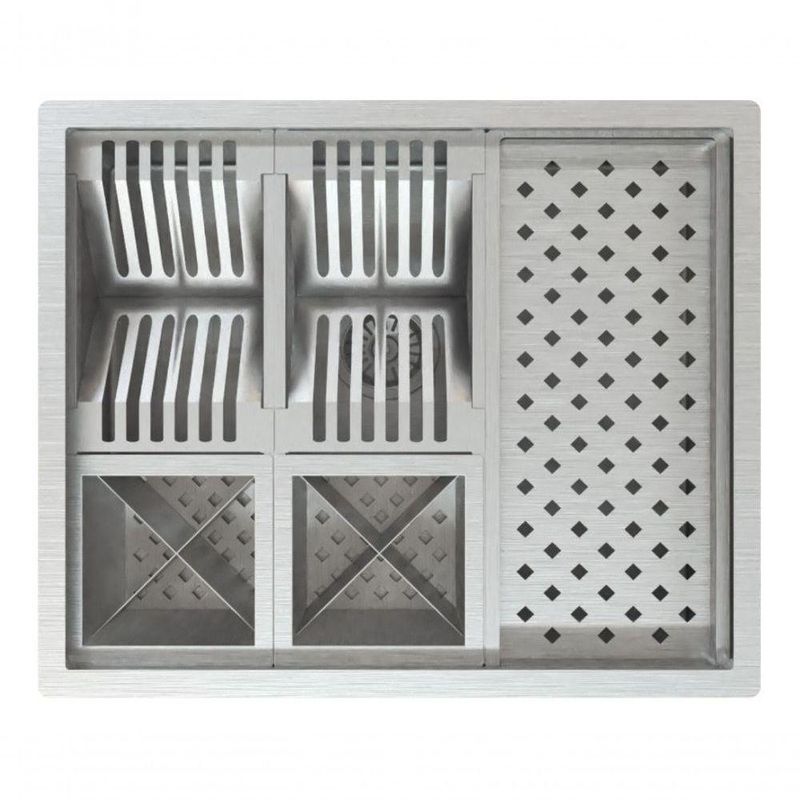 Módulo maior contém: 02 módulos para pratos (total para 12 pratos), 01 grande módulo para copos, 02 módulo com 08 recipientes para talheres e utensílios. (essas partes são removíveis, podendo dividir em apenas 2 partes ou serem retirados para o módulo ficar livre) servindo para talheres, bucha e detergente ou até mesmo vaso de flores.Calha Quadrada Escorredor Umido