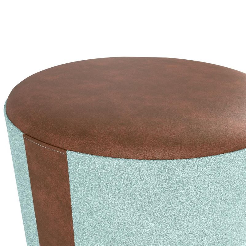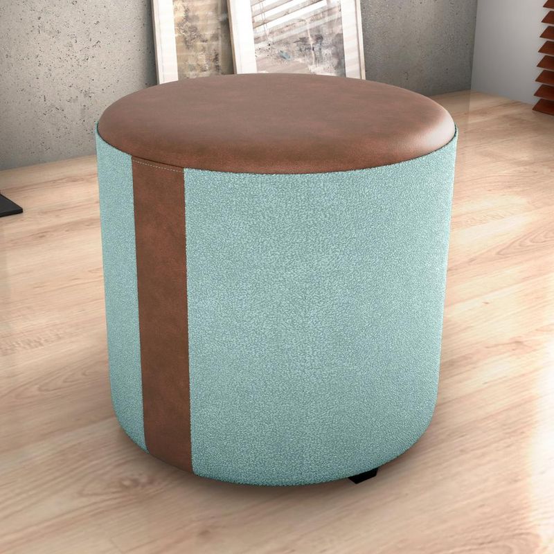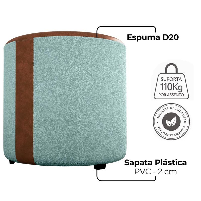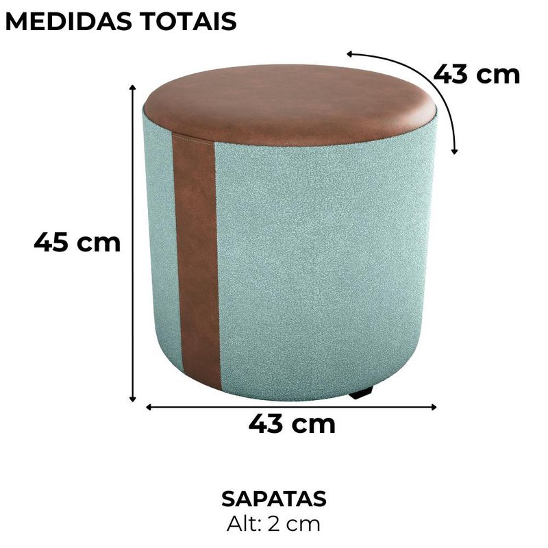 Puff Redondo Copenhage, conforto e estilo compacto! Estrutura em Madeira de Eucalipto (de reflorestamento) e MDF, estofado com espuma D20 e revestido em tecido Bouclé (macio e encorpado) com detalhes de costura em Corino Marrom (laterais e assento), além das sapatas plásticas (PVC) e design redondo que suporta até 110 kg. Este produto será entregue em 01 volume.