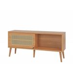 Os detalhes em palha na porta de correr conferem um charme especial ao móvel, tornando-o ainda mais elegante. Os pés em madeira proporcionam uma base firme e estável, além de complementarem o design moderno do rack.