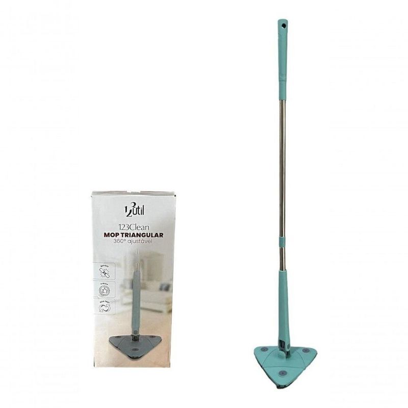 O Esfregão Triangular Rodo Limpador Giratório Mop Com 2 Refil é composto por plástico, aço inox e microfibra. Seu cabo tem tamanho de 120 cm e a base é de 25 cm.