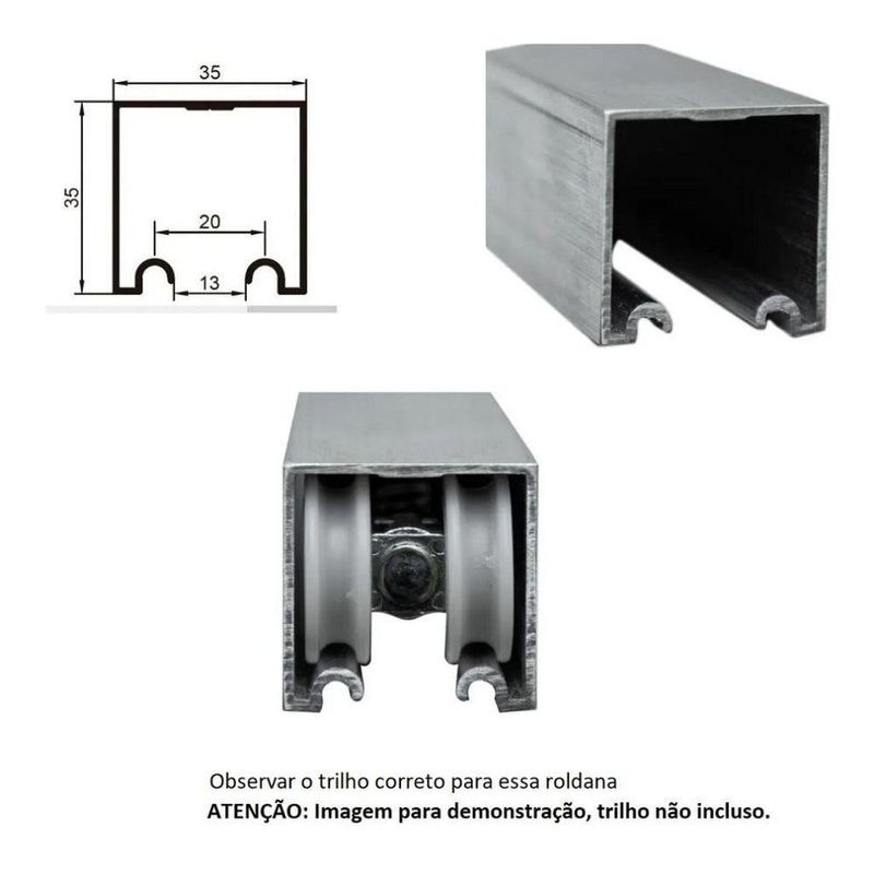 Especificações: Carga suportada: 60kg; Trilho utilizado: PF-801; Roldanas de Nylon injetado; Eixo e suporte de aço bicromatizado; Rolamento blindado; Acompanha parafusos e chaveta para fixação;