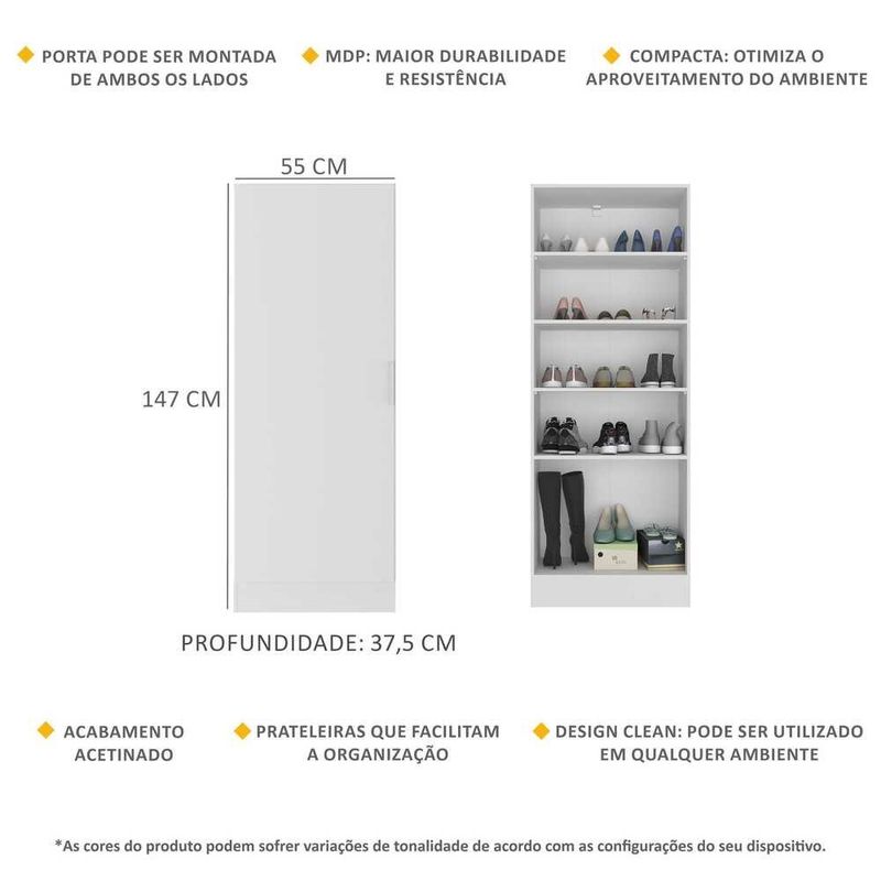 A Sapateira 1 Porta Jade Multimóveis é produzida em MDP com acabamento acetinado (cerca de 20% de brilho), que garante maior durabilidade e resistência. Super versátil, pode ser utilizada como sapateira, estante para livros ou armário multiuso. Possui 4 prateleiras (suportam 6kg cada), sendo 2 fixas e 2 móveis, e a porta pode ser montada de ambos os lados, conforme sua preferência. Compacta, é uma excelente opção para manter seus sapatos organizados e otimizar seu espaço, para que você possa aproveitá-lo da melhor maneira possível. Cada prateleira comporta 3 pares de calçado, totalizando 15. Com design minimalista e de fácil montagem, pode ser utilizada em qualquer ambiente.