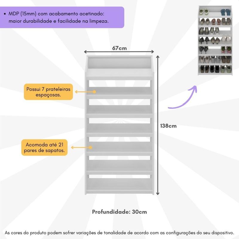 Descubra a solução perfeita para organizar seus sapatos com elegância e praticidade! A Sapateira Vertical 67cm com 7 Prateleiras Multimóveis CR35252, produzida em MDP de 15mm com pintura UV, oferece durabilidade e resistência incomparáveis, garantindo que seu espaço fique sempre impecável. Com 7 prateleiras espaçosas (suportam até 3kg em cada), ela é capaz de acomodar e expor até 21 pares de calçados. Ideal para quem valoriza organização e estilo, essa peça transforma qualquer ambiente, proporcionando o conforto de encontrar o par perfeito sem complicações.