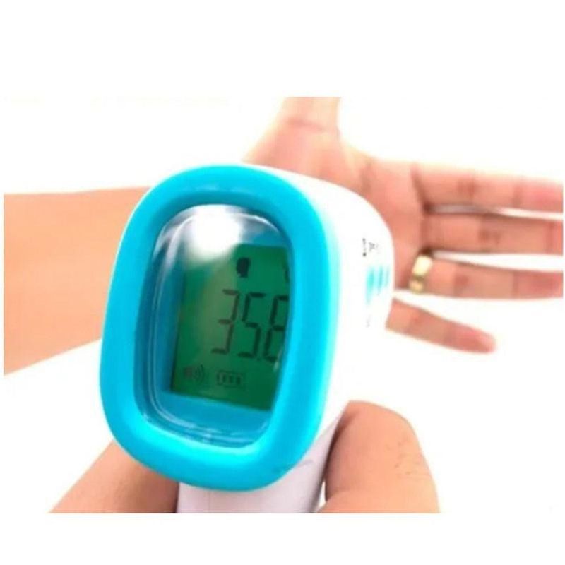 Este termômetro é digital e infravermelho, bastando apontar na testa, ouvido ou para qualquer parte do corpo, a uma distância entre 1 a 15 cm, que em aproximadamente cinco segundos a mensuração da temperatura aparecerá com precisão no visor.